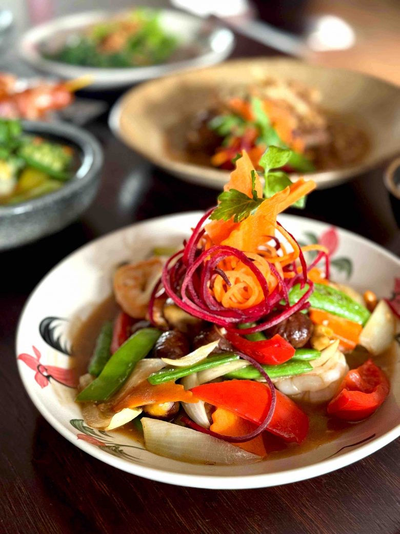 ‘Pad Ngo Guay’ Stir-fry King Prawns with local sweet chestnuts, cashew nuts, fresh peppers, young onion and spring onion
